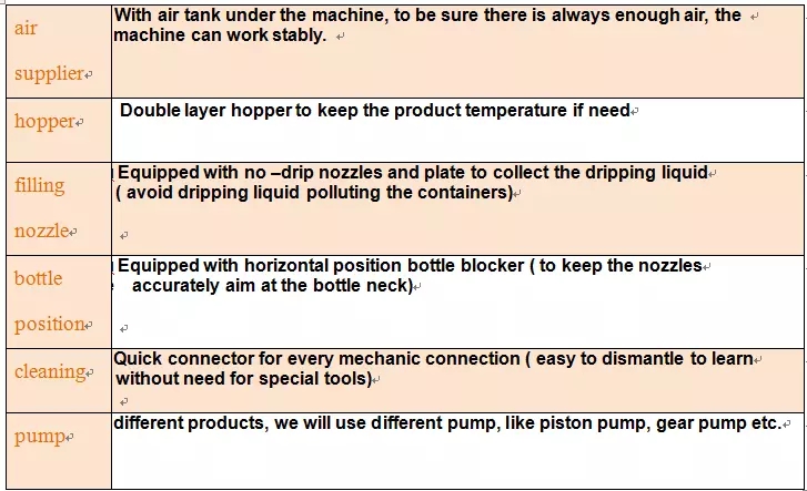 Deze machine is speciaal gemaakt voor alle soorten viscositeit / vloeistof in de voedingsindustrie, de chemische industrie en comodity, zoals motorolie, motorolie, salade, handwasgel, kokosolie, sojasaus, sesam, shampoo, vloeibare zeep, motorolie , remolie, bakolie, tomatensaus, drank, etherische olie, plantaardige olie, honing, pepersaus, pindakaas, yoghurt, sap, drank enz. Alle contact met de vloeistof / saus is van hoge kwaliteit roestvrij staal. De machine keurt zuigerpomp voor het vullen goed. Door de positiepomp aan te passen, kan het alle flessen in één vulmachine vullen, met hoge snelheid en hoge precisie.